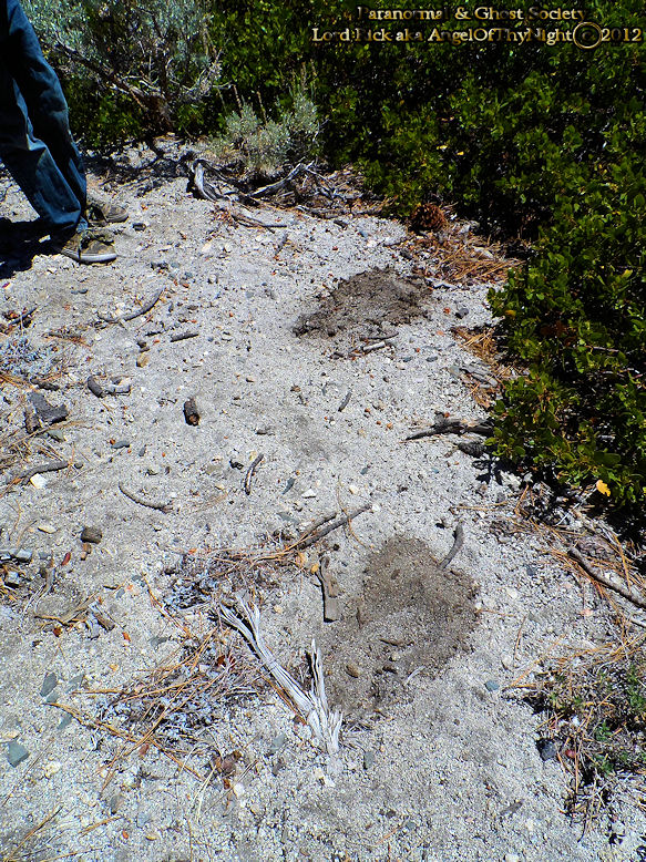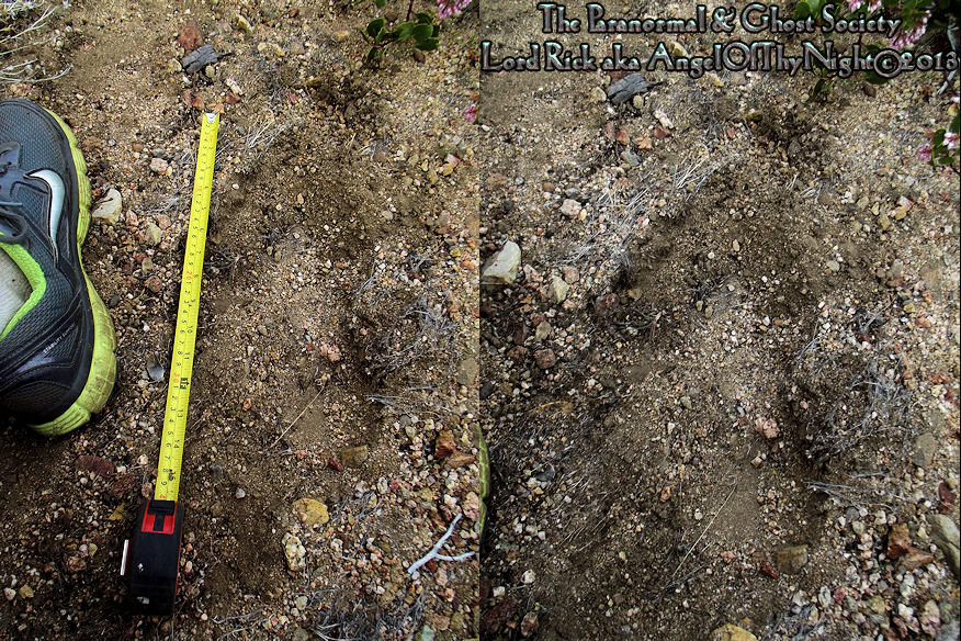 These tracks appear to be traversing from the bush onto the soft decomposed granite. Their were only two tracks with nearly a 5' to 6' stride. I thought they were strange as the brush is about 4' in height and it looks as if something mowed their way right through it creating the tracks. Video footage of them is further below on this page!