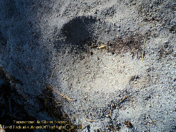 This impression was found along Silver Creek! Can we say its Bigfoot? Possibly but again their is no reassurance. I found a set of tracks that appeared to be following the creek they were barefoot. The toes are very far apart and much larger then an average human. This was a much better impression so I photographed it. My theory is that whatever it is follows the creek then lumbers back up to Silver Mountain which is such a harsh terrain that even hikers have difficulty with the area.  This is not the type of area you want to walk around barefoot in.