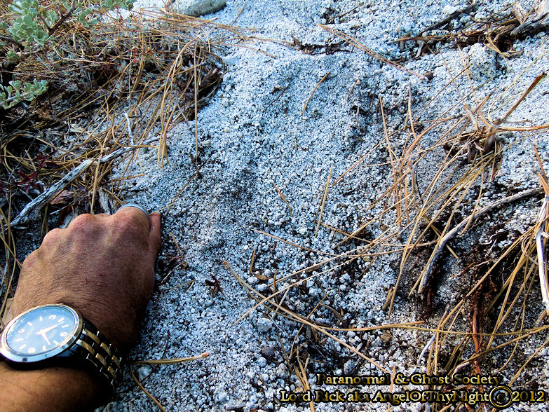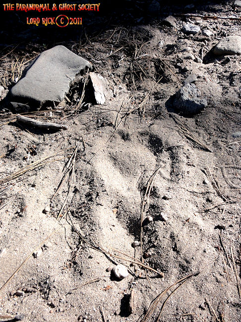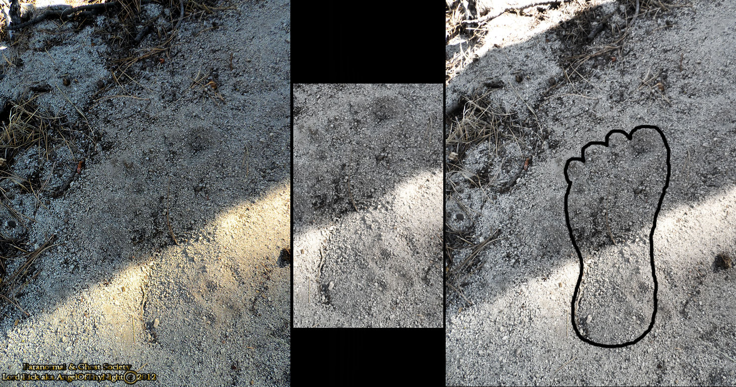 We discovered this track in some decomposed granite which is so soft its similar to sand thus it leaves some great impressions. The impressions you are viewing is that of a barefoot we found it in the middle of the forest and it measured about 16" in length. You can clearly see the impression of the toes, heal and wide width of the foot itself. The track is hard to see thus I traced what it looked like notice that only four toes are visible. It is not uncommon for Bigfoot prints to have four toes and some primates. This was an amazing find by Jarrod and I while track finding in the forest of Jobs peak!