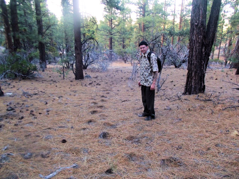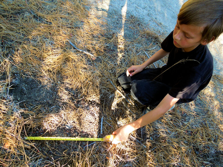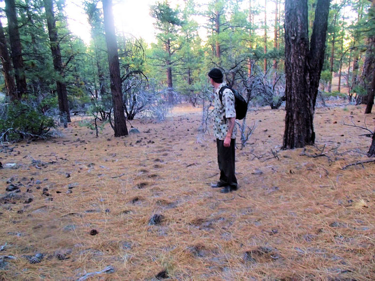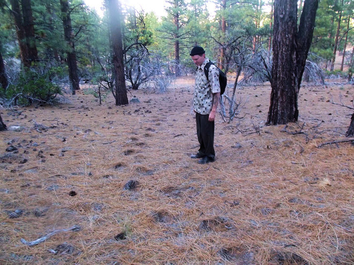 These tracks measure about 16" in length found near where we discovered tracks in expedition three! What is reasonabily surprising is that the depth and length seems to be similar to other tracks we found in other regions of Jobs Peak. This might mean that the same creature is consistently creating them and can travel quite the distance. I did multiple comparisons such so that you can get different angles of the tracks. For example the photo to the upper left shows the stride, upper right shows the length, lower left my foot compared to the track and lower right Jarrod taking measurements. Its a large track and heavy enough to kick out the pine needles to form this impression.