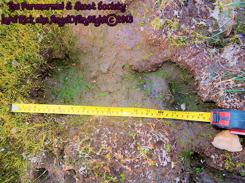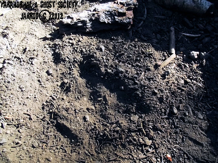This is a very old track we discovered however one thing is noticeable about it is its very large size. Their are even some toe impressions to the left within the print although they are hardly visible as dirt is starting to consume the track. The heel to the right is not as deep this could be because whatever made it put more weight on its toes as it was found on a slope. I am not saying this is a Bigfoot track but it is quite possible since during our expedition we heard some strange noises and movement a few hundred feet from here.