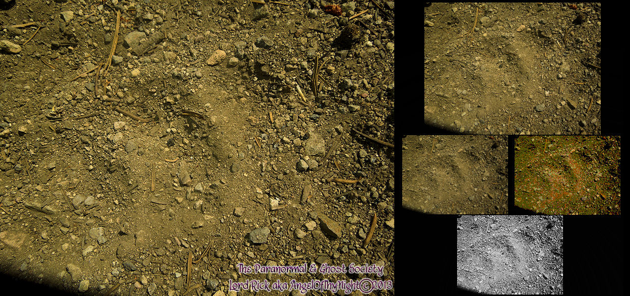 I found these three large toe impressions in the woods. With infared and other techniques we were able to emhance the image so you could see the impressions much better. The three toe impresssions were made by something with a very wide and large foot. Each toe impression is twice the width and length of my big toe if persay I could describe them. We do think that a Bigfoot like creature left these behinds. Since most of the earth is very rock and hard the toe impressioned were formed in the sandier part. Where the heel would be nothing was left behind as there is less sand and much larger pieces of granite.