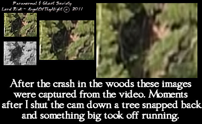 I believe the face peering back at me is Bigfoot. I actually took some video footage then clipped this image from it which reveals a fairly large face staring back at me. It could just be a fluke caused by the leaves and brush however we still as a paranormal organization have to document our finds openly with theory, speculation and honesty. What I can tell you is that I smelled an intense odor higher up on Mount Raymond. I also heard something big moving around. I had an experience with a tree snapping from right to left then something ran on off. Later I would be followed off the mountain and that is where we found a broken tree limb that was not broke earlier near where we parked the truck. Whether this is an image of Bigfoot or not we can agree that there was something in the woods on our first expedition we know that much!