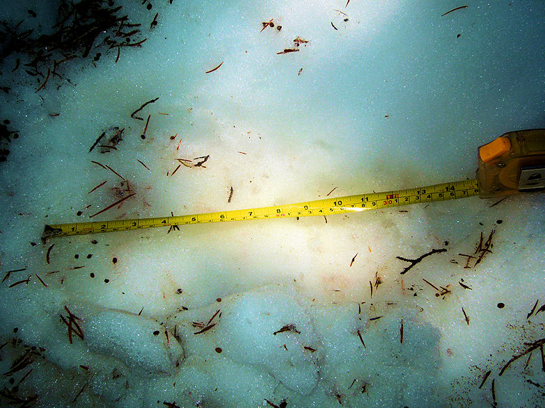 I found this impression on a bank of snow notice how it fans out where the toes are suppose to be. Its also nearly 15" in length and their is a bit of an impression where the big toe touched down.