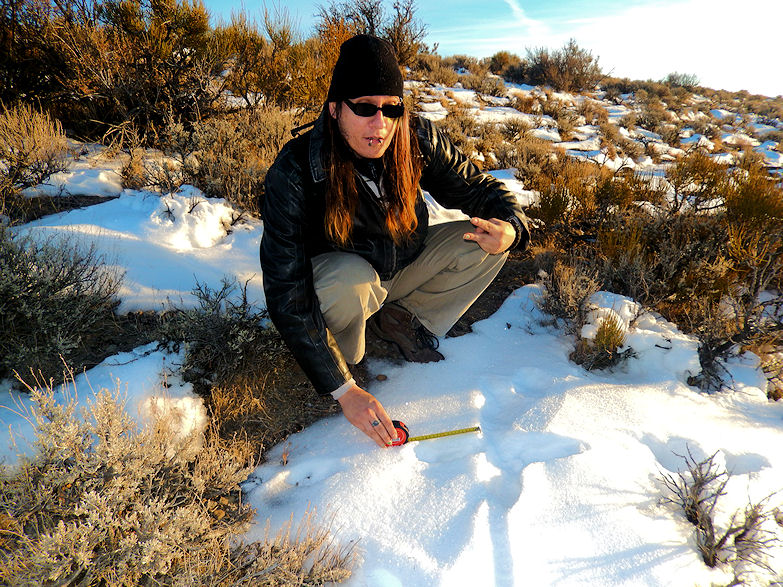 You can see Jarrod measuring the tracks which go down the hill just behind him however is the circular impression we found. It is as if a UFO landed on the hill something had gotten out walked down the bank then vanished without a trace. If you look at the measuring tape next to the track you can see that the track is about 8 inches and 4.5 inches wide so we know its not a coyote nor a rabbit. Where the toes are its very curved just as their is some curvature of the foot as if  the feet point inward. These are only a few tracks their was one in front of another as if what made them had a small stride but rather larger feet. This could have been an encounter of the third kind where the beings actually left the ship. Further below on this page are photos from the investigation and some photography of the area. One can see that it is very vast, secluded and a good area for something from another world to touch down at.