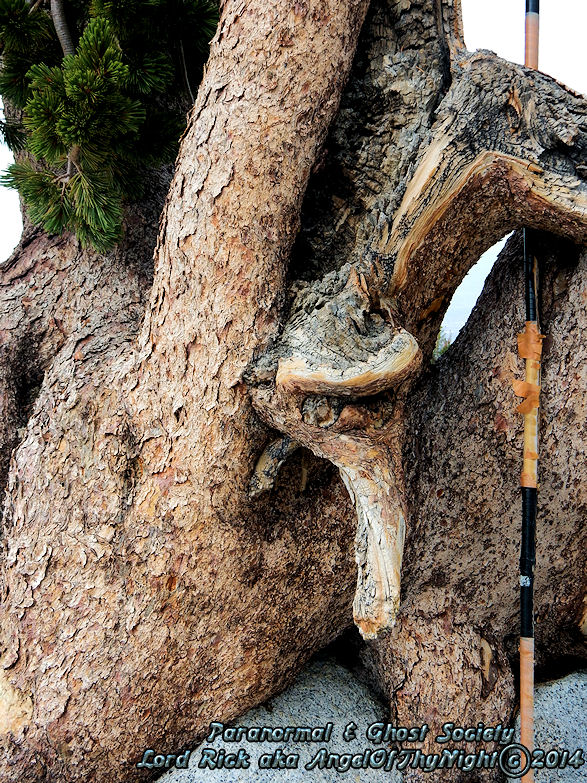 My son and Richard pointed this out stating it looked like a face perhaps even a wizards head. I have to say this most certainly was a bit odd not paranormal though. Its just the ugly disformed tree near the summit that grows wildly in all directions with a little face that peers through the trunk.