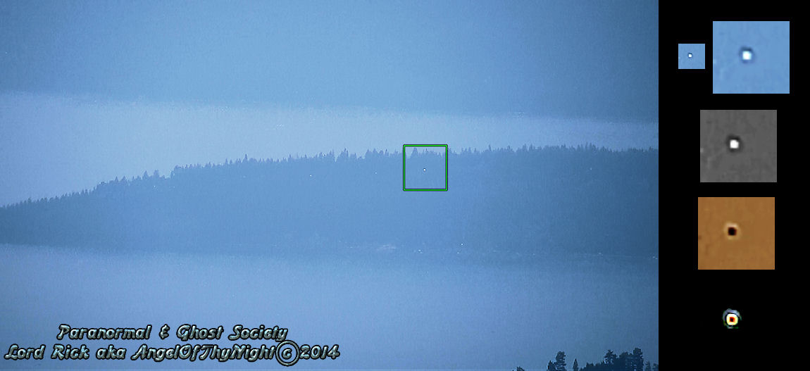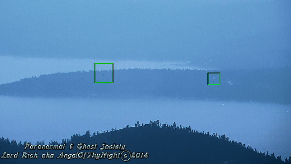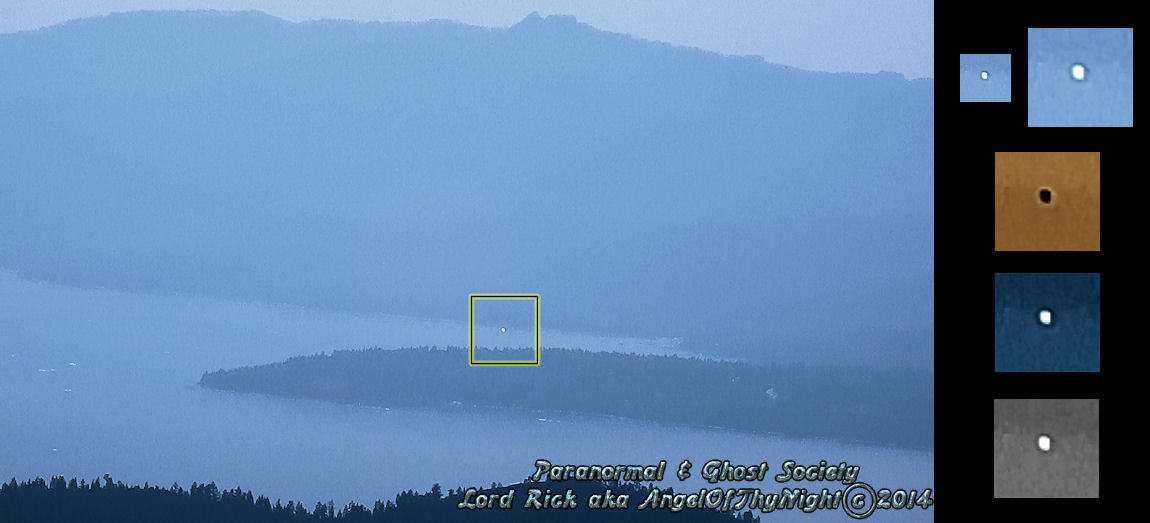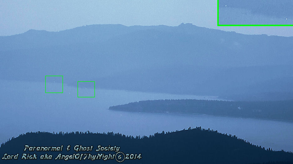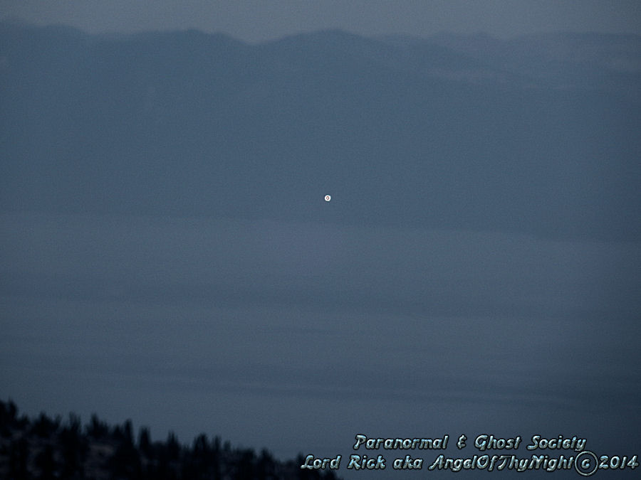 The current object you are witnessesing is hovering over North Lake Tahoe at about a distance of 18 to 20 miles.  One of our investigators told me what appears to be something very bright signaling us such as a mirror. My back was turned on the peak because I was eating my lunch and relaxing from our journey to the top of Slide Mountain. Our investigator was new so at the time he had no idea that this was no mirror in fact if you study this object you will see that its hovering over Lake Tahoe over one of the deepest parts of the lake.