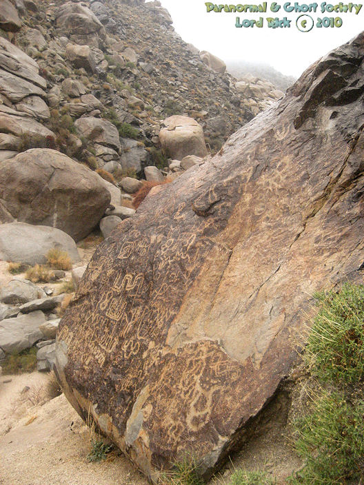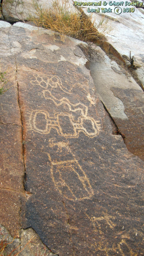 - - The Natives including the Hopi Tribe once believed that the world began here at Spirit Mountain also known as Avi-kwa-ame which is a very sacred site to the native american tribes present along the Colorado River....along where the three states of AZ, NV and CA. The grapevine canyon area is just one of the many deep canyons that run deep into this sacred mountain. Their are other names for the mountain such as Newberry Peak......Dead Peak and is rumored to be the center of creation for all Yuman Speakers. Sadly as mystical and beautiful the area is many tourist are ruining the location. It saddens me when I hike in such a place only to find water bottles.....wrappers....and vandalism such as spray paint. It makes you wonder why someone would do this to a site that is thousands of years old and has tales of even life after the great flood.. Spirit Mountain is 5,639 feet high and played a very large role in the relious and mythological beliefs to the Mohave, Hualapai, Havasupai, Yavapai, Pai pai and Maricopa Tribes. Notice I left out the Hopi because I read that they were here prior to other tribes. The Hopi Indians were said to survive multiple apocalypses and everytime one would occurr they would go underground. I believe hidden within Spirit Mountain is hidden cave or burial ground. Today three Native American Tribes continue to use this area for their tribal ceremonies and practicing of ancient traditions. It is named a traditional cultural property and also listed on the National Register Of Historical Places. Unfortunately not even that can protect this sites ancient history. Its a well visited area just very few dare to venture past the canyons treachurous walls of rock formations.....thorns and overgrown grapevines. The road that ran up into Grapevine Canyon was called Christmas Tree Pass because often the trees were decorated with ornaments. This was a local practice that was eventually banned because it was becoming to difficult to maintain. As I said a good thing doesnt last to long but I found that fact interesting. To the natives it was an eye sore I am sure since nature is meant to be preserved not decorated. When you are in Christmas Tree Pass you will come up to the entrance of Grapevine Canyon which boast a fresh water spring that flows down the canyons wash. In the canyon their are quite a few pools of shallow water and a few small waterfalls. Due to this fact it draws in Big Horn Sheep and other animals from the Newberry Mountains to graze and drink the cool waters. The first couple hundred feet at the mouth of the canyon are littered with Petroglyphs also known as rock art drawings. Some say their are more petroglyphs here then all of southern Nevada. I never did see that many Petroglyphs perhaps because they only grace the entrance of the canyon and we hiked deep into it. If you look further below you will see a photo of a UFO depicted on one of the rocks which greet those who dare enter the canyon. The southern Paiute tribe are said to once have camped in the canyon itself while the ancestors of the Mohave Tribe also known as the Amacava built rock shelters around 1100 A.D. Their are many rock formations we crawled into that could be used from shelter. Their are burial mounds within the canyon and today its still a very active area for pilgramages. Rumor has it that some of the best views of the Southern Colorado River can be seen here including the city of Laughlin. I would not know because when I explored the area their was fog thicker then pea soup. I stood on a peak and couldnt even see the canyon we hiked up into. The odd rock formations on Spirit Peak had fog around them giving this place a very eerie feeling. One of the most unusual mysteries to this area is the petroglyphs which are said to contain photos of flying ships.....possibly ancient astronauts as well. In simple terms scholars believe that since the petroglyphs are over 1000 years old and that air craft did not exist during this time it was speculated that the ancient tribes experienced encounters of the third kind maybe even fourth. Also deep within the canyon is an ancient totem or statue which was apparently vandalized which was at one time said to have mystery origins or something rather relevant to those Petroglyphs. I guess that the reasoning behind visiting this site is to give skeptics food for thought that if these tribes depicted space ships in their rock art then isnt it possible that their is life outside of our solar system that once perhaps visited this ancient site? What it really comes down to is that the Shamans believed this place held supernatural powers. I somewhat believe it too you can feel something in the air here its different then other locations I hike and explore. This is a powerful place and I get to share this journey with all of you one taken with my family as we spent hours exploring all its wonders. Remember those who venture to this location keep in mind some canyons are almost impossible to get out...their are drop offs.....and it is an ancient site. With that being said treat the area the way you like to be treated appreciate it....take photos....leave foot prints and nothing more! © By Lord Rick - Grapevine Canyon & Spirit Mountain - Action Shots - Nightfall - Grapevine Canyon Petroglyphs Newberry Peak, NV http://www.johngregg.com/gra1.htm For the Yuman-speaking inhabitants of the Colorado River region, no location was more sacred than Avikwa'ame, or Spirit Mountain, which we call Newberry Peak, in southernmost Nevada. According to the Mojave creation myth, the oldest spirit was Matavilya, made from the mating of Earth and Sky. Matavilya had two sons, Mastamho and Kaatar, and a daughter, Frog. Matavilya committed an unwitting indecency that offended his daughter, who then killed them. Mastamho directed the cremation and mourning ceremony for his father and, when completed, strode up the Colorado River Valley. When he got to the top Mastamho created the river b