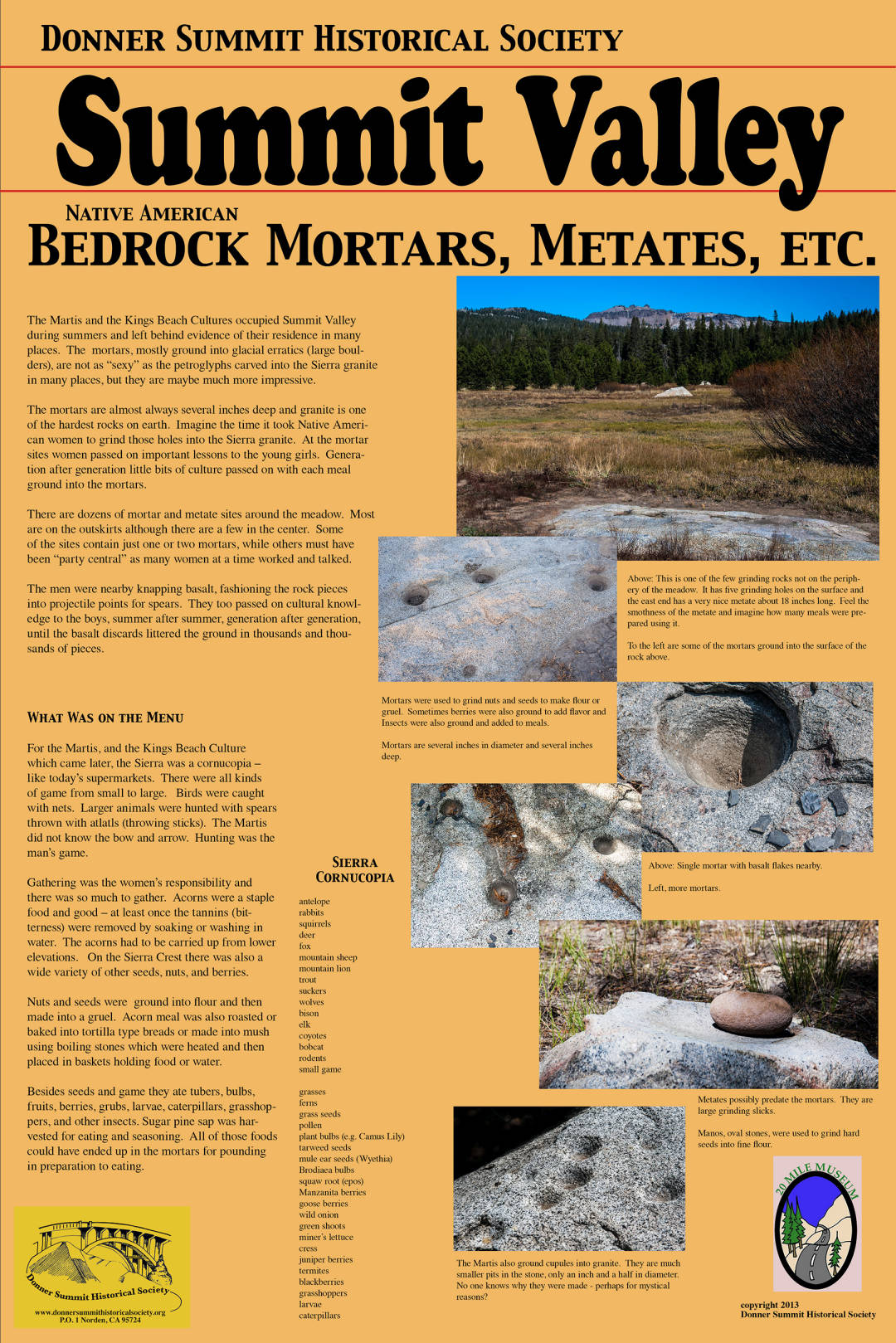 ![]() ![]() ![]() ![]() ![]() ![]() ![]() ![]() Summit Valley was inhabited by the Natives for thousands of years. As a matter in fact the Martis tribe hunted and gathered during the summers in this valley from 2000 B.C. till about 500 A.D. Today so very little remains that they even existed nobody even knows where they migrated too next some even believe Yosemite. If you explore the valley thoroughly your going to find petroglyphs, metates, mortars and basalt flakes. The valley was very fruitful and it still is but it definitely does not look like it did when the Martis inhabited the area. Men would hunt although they used spears the bow and arrow was not known to the Martis tribe. The women would gather caterpillars, grass hoppers, grass, berries, grubs, tree sap, acorns etc then they would grinding them into the Mortars. The men would use nets to capture birds, fish and they hunted deer. When the Martis left other tribes did inhabit the area or rather migrated to this valley during the warmer months. More then likely they lived in bark houses which are all long gone however the mortars took years to create which meant that the natives spent years here living on the edge of Lake Van Norden and along the south fork of the Yuba River. We know the natives were here for thousands of years because some of the petroglyphs found in the area date back to 4,000 B.C. The first white Europeans to have arrived in the area were trappers. Eventually a road would be built in 1862 to 1864 by the transcontinental railroad from the west by the Central Pacific. That road would be known as the Dutch Flat Donner Lake Wagon Road which was a toll road. At the time it was used to carry supplies and equipment to the construction sites for the railroad including the Donner Summit Railroad Tunnels. It was a well used route at its peak 85 train cars of freight were unloaded via wagon in Cisco which then would be transported to the Summit. At times wagons might have been backed up a couple miles on this route especially in Summit Valley. In 1868 the railroad was completed therefore the road seen very little traffic. Most folks took the railroad instead of traveling via wagon and freight could easily be loaded onto train cars. It was a bit eerie to take this road in the 1870's because many hotels, barns, homesteads etc remained abandoned. Most of them were in a state of disrepair due to the weight of the snow collapsing the roofs while others were simply burnt down due to fires. When the Van Norden Dam was built most of the road was submerged under the lake. In 1976 a breach occurred in the dam which led to the lake waters receding therefore the old wagon road would once again be exposed which today is used as a hiking and biking trail for some.
