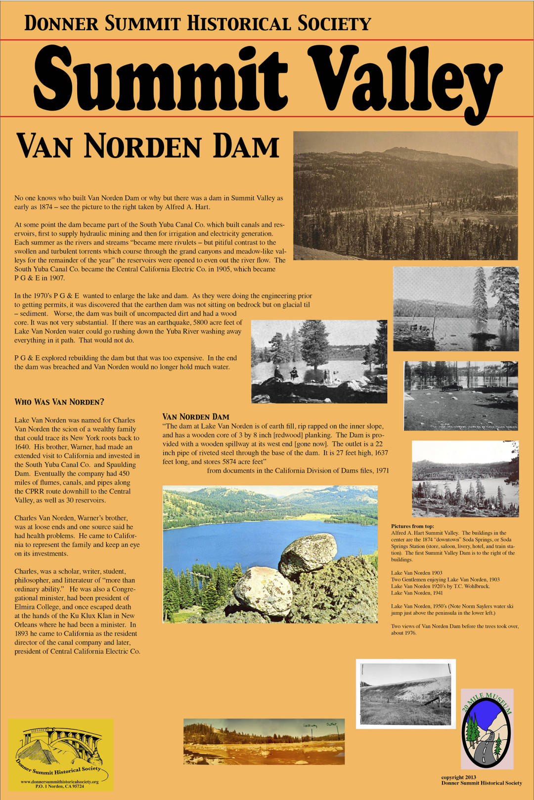 In the 1970's PG&E was looking at enlarging the lake and perhaps renovating the dam. What they realized is that the dam was residing on sediment not bedrock. They also realized the earth it was composed off was not compacted and that it had a wood core. The dam was not sturdy at all which meant that during a terrible storm with flooding or even an earthquake could end up causing chaos if it ever broke. As a matter in fact 5,800 acre feet of water well Lake Van Norden would end up heading south downstream on the Yuba River therefore causing mass destruction. Many of the rivers downstream from Dams go right through small towns throughout the Sierra Nevada. I always am concerned when I see dams with cracks or even some earthen dams. Reason being is that the flooding, storms and even freak earthquakes can be destruction and a manmade dam is not going to stop mother natures wraith. Therefore lives and even some structures were at stake and they always will be! It was to expensive to rebuild the dam I know PG&E renovated it so that way they could breech it slowly letting out the water downstream. Unfortunately this had led to Lake Van Norden shrinking quite considerably. As a matter in fact I believe in theory that this is what is known as a Vanishing Lake. As it stands right now the lake is about 70 to 80 acres in size. Over the years it continues to dissipate and probably in another decade or so this probably will become a wet meadow rather then a lake. When I hiked in Summit Valley it felt a bit strange knowing the trails run right through what once was underwater. It really is hard to understand the sheer size of the dam since most of it is barely visible. With high grass growing everywhere and foliage you sort of lose sight of it. However, what I can tell you is that the dam is 27' high, 1637' long and is composed of 5874 acre feet. I stood on top of the dam where their is a rusty wheel which at the time was used to slowly let water draining Lake Van Norden. Who is Van Norden well according to the Donner Summit Historic Society: Lake Van Norden was named for Charles Van Norden the scion of a wealthy family that could trace its New York roots back to 1640. His brother, Warner, had made an extended visit to California and invested in the South Yuba Canal Co. and Spaulding Dam. Eventually the company had 450 miles of flumes, canals and pipes along the CPRR route downhill to Central Valley, as well as 30 reservoirs. Charles Van Norden, Warner's brother, was at loose ends and one source said he had health problems. He came to California to represent the family and keep an eye on its investments. Charles, was a scholar, writer, student, philosopher and litterateur of "more than ordinary ability." He was also a Congregational Minister, had been president of Elmira College, and once escaped death at the hands of the Ku Klux Klan in New Orleans where he had been a minister. In 1893 he came to California as the resident director of the Canal company and later, president of Central California Electric Co. When the early Europeans and emigrants came to this valley they made it their home. Their was the Dutch Flat Donner Lake Wagon Road, Hotels, Stores, Homesteads, Reservoirs, Dams, orchards, dairy farms, cabins, snow sheds, first transcontinental highway, railroad, saw mill, an ice house, stage stops and even ranches. The Yuba River traverses right through the center of this valley. Since it is dammed off it held back the waters of Lake Van Norden for a century. Unfortunately each year the lake shrinks soon their will not be a need for a dam. The river connects to Castle Creek part of our adventure would take us along the river and creek. This is why Summit Valley is so lush its really a sanctuary for wildlife considering its rich grazing quality. The valley surrounded by 10 to 12 thousand foot peaks is truly a gem. However, many folks associate the valley with the Donner Party just a few miles away.