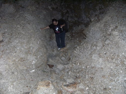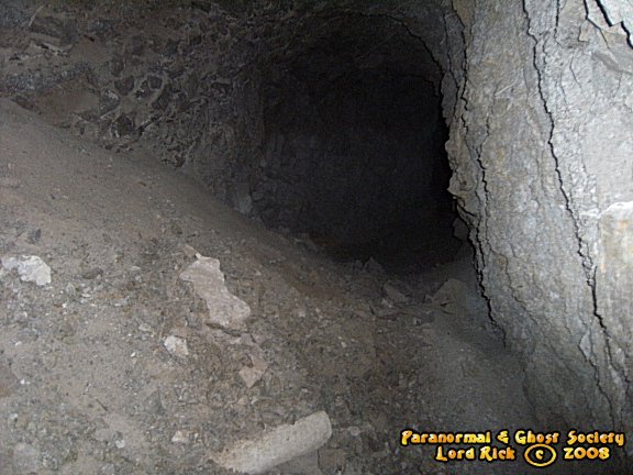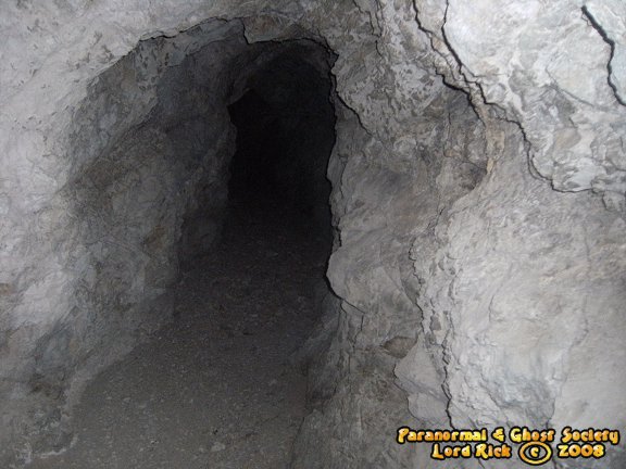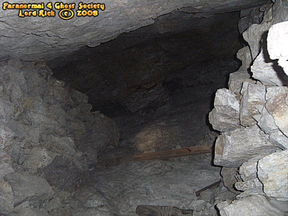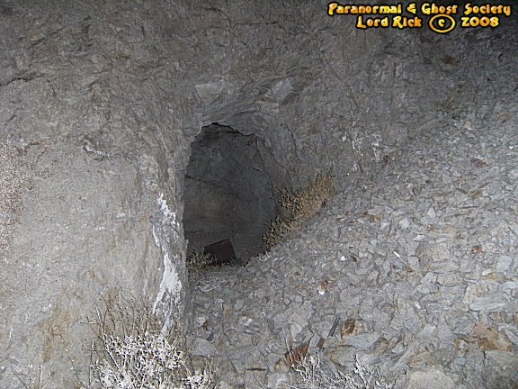 The Gettysburg Mine sits up on a mountain with a deep canyon bordering it. As far as I know their are 3 entrances and the 4th one is at the time of a rectangle like peak which is a deep steep shaft. You could technically climb the shaft to the top and come out onto the peak. We noticed some old rails within the mine but its not a large place the first tunnel splits in a Y one way is a dead end and the other leads up a shaft that comes out at the peak. The other two sit on a very steep ridge and both connect. The one tunnel you climb up the shaft then cut to the left down a crawling tunnel and down a steep shaft which comes out the third tunnel. Its a pretty interesting place and the people who owned it named it after the town of Gettysburg which they were from that area. It does not look as large as the Pittsburgh or Jubilee but it did have have various sorts of mining within it such as tunnels, rails, and vertical shafts. Boot pointed out here some of the fault lines that the miners dug into which means some level of danger could occur if an earthquake were to happen while in this mine. In front of this mine or near it was the old stone cabin of the little oriental guy who processed the gold at the processing area and stamp mill just across from the caverns of the Gettysburg. © By Lord Rick