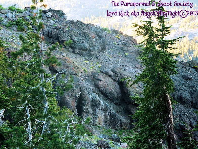 I use my cameras zoom to focus in on this cave entrance on the left side of this rock outcrop. When people ask where does Bigfoot live since its a very elusive cryptid. Well the answer is simple since the peaks of most of the mountains in the sierras are volcanic it also leaves behind caverns and lava tubes which could provide shelter.