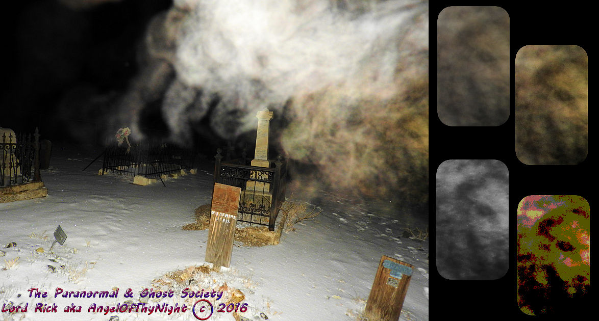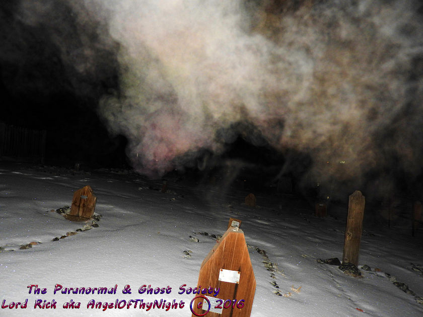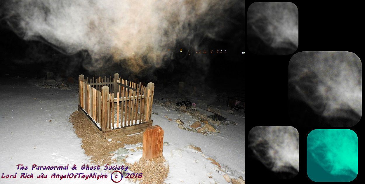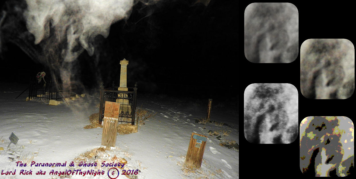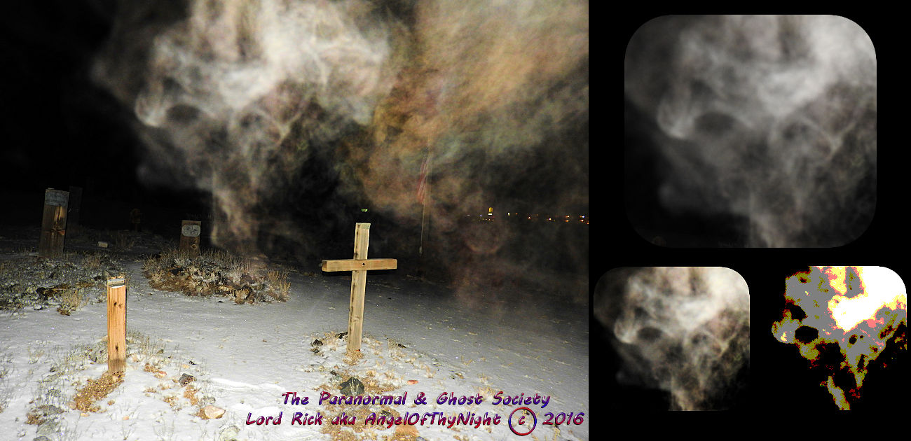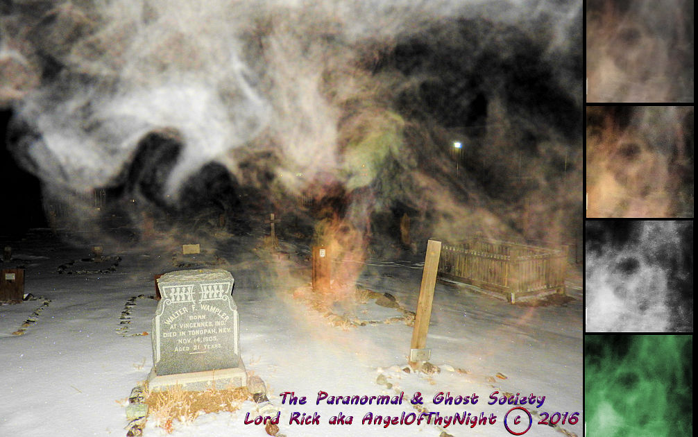 ![]() This is a very amazing photo captured not far from where the miners died in the Belmont Tonopah Mining Fire Tragedy. Itr a massive face I do not even really need to post the enhancements you can see the face staring at me directly in the middle of the picture. I tend to do allot of talking to entities when I work with them therefore at times they have been known to be photogenic for me. This picture really is something special and just proves that the cemetery may be one of the most haunted locations in Tonoaph Nevada. |