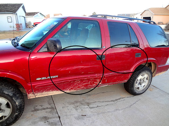 When I went to back up I didn't straight it enough and the ice slammed me against a small evergreen tree. Hell two of my wheels were not even touching the ground but I managed to rock the truck back and forth eventually spinning the truck enough to pull on out of there. Little did Tammy and I know but that little tree put two big dents in two of my doors and cracked the plastic on the rear hatch. It also took off paint and scraped an entire groove down the drivers side. So it looks like ill be spending some time installing new doors on my truck in the near future the perks of offroading.