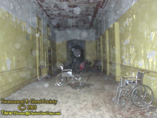 homemade bows. We headed again past the exit sign and it just stopped humming which i felt was odd because the sign never stops. It was a sign that said to me something is there trying to make itself known. We then worked are way around the basement and up to the 4th floor where we came across the hallway with all the wheelchairs. In one of the hallways Tara and Kim said they seen a door move all by itself keep in mind there is no windows that were open nearby it just moved as if it was inviting us to go up to the attic or back to the basement. Further on there was a door that was closed and we opened it. I was the last one in back and i put my hand on it so it