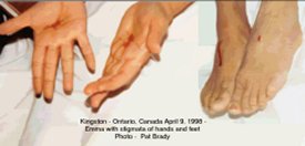 Mystical Stigmatahttp://www.newadvent.org/cathen/14294b.htm To decide merely the facts without deciding whether or not they may be explained by supernatural causes, history tells us that many ecstatics bear on hands, feet, side, or brow the marks of the Passion of Christ with corresponding and intense sufferings. These are called visible stigmata. Others only have the sufferings, without any outward marks, and these phenomena are called invisible stigmata. I. FACTS Their existence is so well established historically that, as a general thing, they are no longer disputed by unbelievers, who now seek only to explain them naturally. Thus a free-thinking physician, Dr. Dumas, professor of religious psychology at the Sorbonne, clearly admits the facts (Revue des Deux Mondes, 1 May, 1907), as does also Dr. Pierre Janet (Bulletin de l'Institut psychologique international, Paris, July, 1901). St. Catherine of Siena at first had visible stigmata but through humility she asked that they might be made invisible, and her prayer was heard. This was also the case with St. Catherine de' Ricci, a Florentine Dominican of the sixteenth century, and with several other stigmatics. The sufferings may be considered the essential part of visible stigmata; the substance of this grace consists of pity for Christ, participation in His sufferings, sorrows, and for the same end--the expiation of the sins unceasingly committed in the world. If the sufferings were absent, the wounds would be but an empty symbol, theatrical representation, conducing to pride. If the stigmata really come from God, it would be unworthy of His wisdom to participate in such futility, and to do so by a miracle. But this trial is far from being the only one which the saints have to endure: "The life of stigmatics," says Dr. Imbert, "is but a long series of sorrows which arise from the Divine malady of the stigmata and end only in death: (op. cit. infra, II, x). It seems historically certain that ecstatics alone bear the stigmata; moreover, they have visions which correspond to their rôle of co-sufferers, beholding from time to time the blood-stained scenes of the Passion. With many stigmatics these apparitions were periodical, e.g., St. Catherine de' Ricci, whose ecstasies of the Passion began when she was twenty (1542), and the Bull of her canonization states that for twelve years they recurred with minute regularity. The ecstasy lasted exactly twenty-eight hours, from Thursday noon till Friday afternoon at four o'clock, the only interruption being for the saint to receive Holy Communion. Catherine conversed aloud, as if enacting a drama. This drama was divided into about seventeen scenes. On coming out of the ecstasy the saint's limbs were covered with wounds produced by whips, cords etc. Dr. Imbert has attempted to count the number of stigmatics, with the following results: 1. None are known prior to the thirteenth century. The first mentioned is St. Francis of Assisi, in whom the stigmata were of a character never seen subsequently; in the wounds of feet and hands were excrescences of flesh representing nails, those on one side having round back heads, those on the other having rather long points, which bent back and grasped the skin. The saint's humility could not prevent a great many of his brethren beholding with their own eyes the existence of these wonderful wounds during his lifetime as well as after his death. The fact is attested by a number of contemporary historians, and the feast of the Stigmata of St. Francis is kept on 17 September. 2. Dr. Imbert counts 321 stigmatics in whom there is every reason to believe in a Divine action. He believes that others would be found by consulting the libraries of Germany, Spain, and Italy. In this list there are 41 men. 3. There are 62 saints or blessed of both sexes of whom the best known (numbering twenty-six) were: