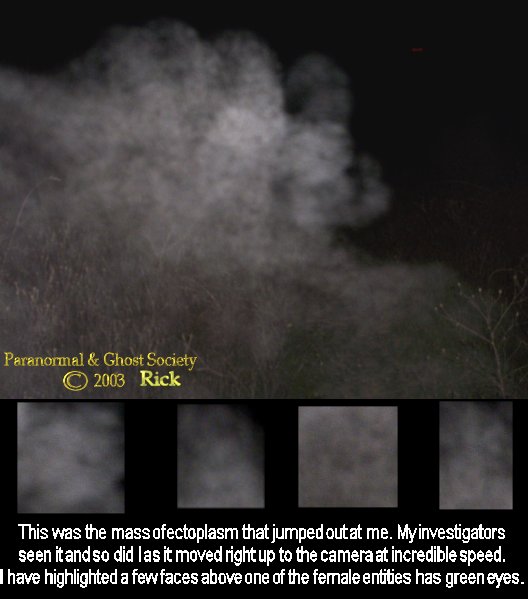 Anyhow it took me a few minutes to calm down I wasn't in fear just excited to be able to see with your naked eye a ghost with its arms coming at you is a rare treat believe me. But we made our way back to the field and Synagogue at this point I caught more ectoplasm in the same areas I caught it on my first visit but the ghost were being very timid and shy. I was only getting bits and piece of them as if they were trying to escape the camera. But I walked by myself in the thick brush and yes I told the entity to come at me again and sure enough something very big started walking towards me. I could not see it but all of sudden it was like something you seen in Jurassic Park the weeds that were 6 feet high were spreading apart and something was walking hard on the ground and walking real fast Leeza said he is walking to you. I could hear it see the weeds opening up and then my battery on the camera ran out:( and I missed capturing this entity sighs so I ran back to them quickly put new batteries in and by then whatever was there was gone.